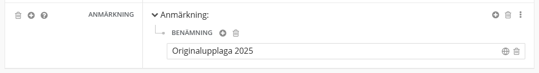 Sök efter ”anmärkning”, klicka på plustecknet framför Anmärkning i träfflistan för att lägga till egenskapen i katalogposten.